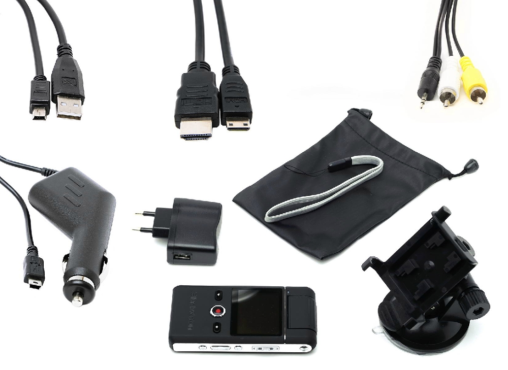 Автомобильный регистратор питается от прикуривателя или автономно. Модель крепится на подвижном поворотном кронштейне.