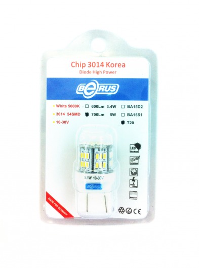 Светодиодная лампа T20 5W предназначена для установки в противотуманные фары и указатели поворотов. Она намного ярче обычных галогеновых ламп, отлично освещает дорогу даже в самую непроглядную темноту и сильный ливень. Цвет свечения со временем не изменяется. Служит такая лампа очень долго, при этом потребляет незначительное количество энергии.