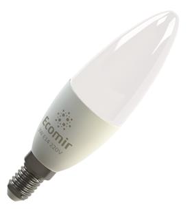 Светодиодная лампа Ecomir E14 3W эквивалентна лампе накаливания мощностью 30 Вт. Колба матовая, имеет форму пламени свечи. Потребляемая мощность – 3 Вт, цветовая температура – 3000 К (это желтый свет). Световой поток — 285 лм. Напряжение —220 В.