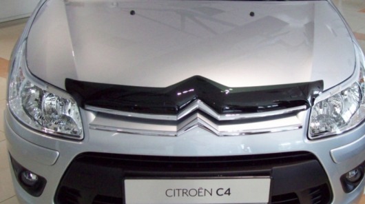 Дефлектор капота для Citroen C4  хэтчбек 3-5-дверного — это щиток из орг.стекла темного цвета, который крепится на переднюю часть капота. Благодаря тому, что дефлектор разработан специально для Citroen C4  хэтчбек 3-5-дверного 2008-2010 гг.в., устанавливается он легко и быстро, при этом сверлить кузов вам не нужно. По форме же накладка полностью повторяет контуры капота. Данная модель прочна и долговечна: она надежно крепится, не боится коррозии, экстремальных температур и серьезных перегрузок.