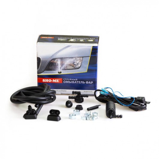 Струйный омыватель фар Sho-Me предназначен для очистки фар автомобиля мощной струей жидкости, подаваемой насосом высокого давления через подпорный и обратный клапан-тройник спаренные форсунки вихревого типа.