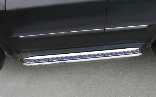Боковые пороги-подножки сделаны специально для автомобилей Jeep Grand Cherokee от 2011 г.в., поэтому устанавливаются достаточно просто и без повреждений корпуса. Помимо этого, стальные пороги с листом для Джип Гранд Чероки смотрятся очень стильно и эффектно. Они добавят вашему авто еще больше солидности и внушительности.