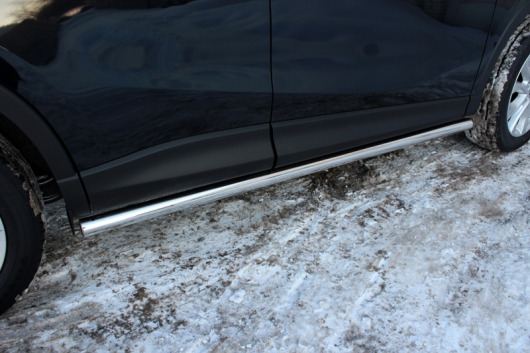 Пороги на Mazda CX-5 – это боковые подножки из нержавеющей стали диаметром 42 мм, которые позволяют более комфортно входить и выходить из салона автомобиля. Подножки Mazda CX-5 очень прочные, надежные и долговечные: они не боятся коррозии, сколов и царапин и выдерживают большие нагрузки.