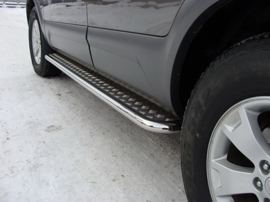 Боковые пороги-подножки сделаны специально для автомобилей Kia Mohave от 2009 г.в., поэтому устанавливаются достаточно просто и без повреждений корпуса. Помимо этого, стальные пороги с листом для Киа Мохаве смотрятся очень стильно и эффектно. Они добавят вашему авто еще больше солидности и внушительности.