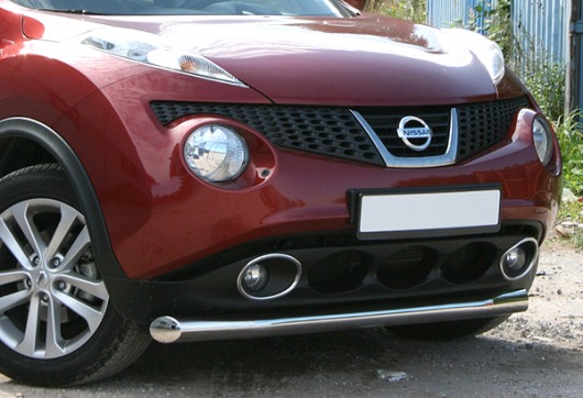 Защита переднего бампера труба предназначена для автомобилей Nissan Juke от 2011 г.в. Вам не придется подгонять защиту под размеры бампера вашего авто. И с монтажом проблем не возникнет: установка защиты переднего бампера производится в штатные отверстия, а значит, необходимость сверлить кузов отпадает.