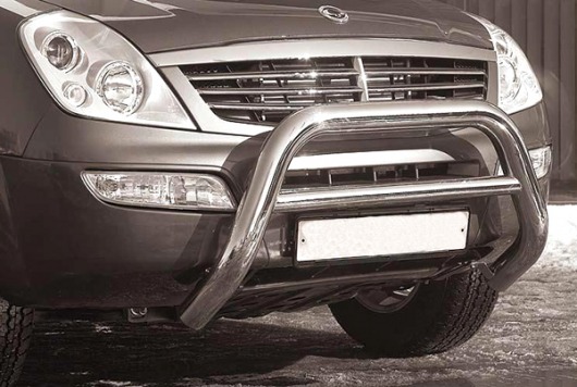 Защитная решетка переднего бампера предназначена для автомобилей SsangYong Rexton от 2005 г.в. без кенгурятника и подножек. Вам не придется подгонять передний кенгурятник под размеры кузова вашего авто. И с монтажом проблем не возникнет: установка кенгурятника SsangYong Rexton производится в штатные отверстия, а значит, необходимость сверлить кузов отпадает.