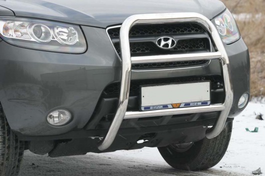 Передняя решетка Hyundai Santa Fe (кенгурятник) – это защитная дуга на бампер из нержавеющей стали диаметром 60 мм.