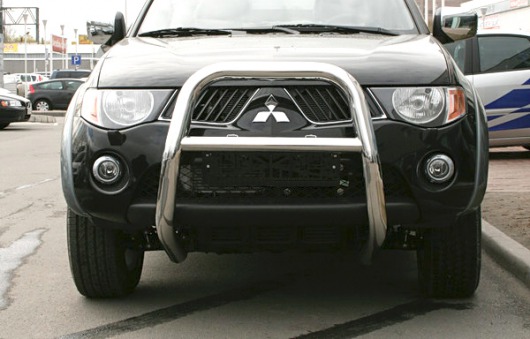 Передняя решетка Mitsubishi L200 (кенгурятник) – это защитная дуга на бампер из нержавеющей стали диаметром 76 мм.