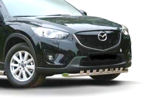 Защита переднего бампера труба с декоративными профильными элементами предназначена для автомобилей Mazda CX-5 от 2012 г.в. Вам не придется подгонять защиту под размеры бампера вашего авто. И с монтажом проблем не возникнет: установка защиты переднего бампера производится в штатные отверстия, а значит, необходимость сверлить кузов отпадает.
