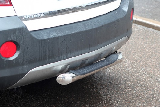 Труба на задний бампер Opel Antara защищает задний бампер автомобиля от различных механических повреждений при столкновениях на дороге и неудачных парковках. А кроме этого, ступень на задний бампер для Опель Антара — это еще и деталь тюнинга, а также дополнительная подножка для авто. Красиво и практично.