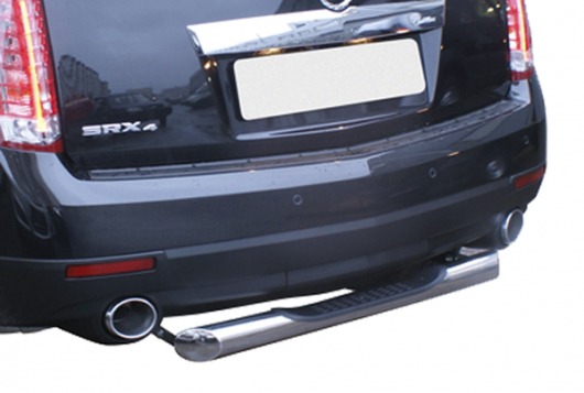 Труба на задний бампер Cadillac SRX защищает задний бампер автомобиля от различных механических повреждений при столкновениях на дороге и неудачных парковках. А кроме этого, ступень на задний бампер для Кадиллак SRX — это еще и деталь тюнинга, а также дополнительная подножка для авто. Красиво и практично.