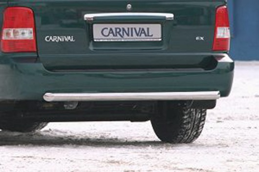 Защита заднего бампера труба предназначена для автомобилей Kia Carnival 1999-2006 г.в. Вам не придется подгонять защиту под размеры бампера вашего авто. И с монтажом проблем не возникнет: установка защиты заднего бампера производится в штатные отверстия, а значит, необходимость сверлить кузов отпадает.