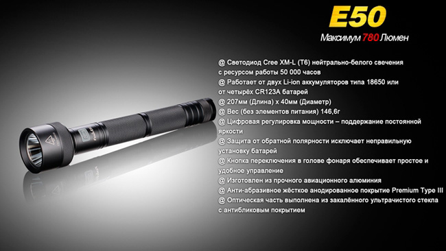 • Надёжность. Ресурс диода CREE XM-L T6  составляет фантастические 50 000 часов (около 5 лет работы). А противоударный корпус фонарика изготовлен из анодированного авиационного алюминия. Свет проходит через сверхпрочное закалённое стекло, также нечувствительное к ударам и устойчивое к царапинам. Наконец, фонарику Fenix E 50 не страшна непогода, даже в сильный ливень Вы можете использовать его, не прикрывая ничем. Более того, если водонепроницаемый фонарь упадёт в воду (глубиной до 2 метров), с ним ничего не случится.