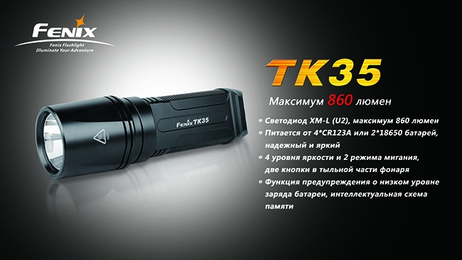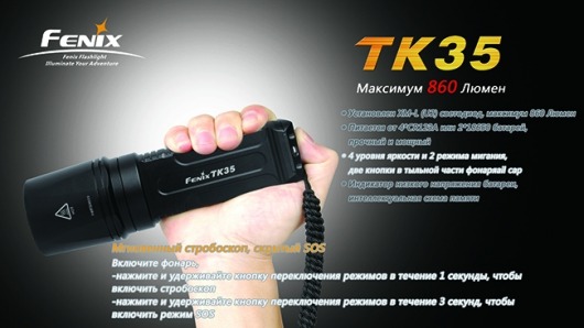 Поисковый фонарь Fenix TK35 — хит продаж, надёжный, удобный и мощный фонарь от компании Fenix. Это отличный туристический и поисковый фонарь, благодаря новому диоду и совершенной конструкции имеющий высочайшую мощность. Данная модель подойдёт прежде всего поисковикам, спелеологам, альпинистам — всем  тем, кому средних показателей яркости фонаря явно мало.