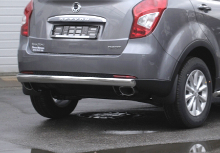 Защита заднего бампера труба предназначена для автомобилей  Ssang Yong Actyon от 2013 г.в. Вам не придется подгонять защиту под размеры бампера вашего авто. И с монтажом проблем не возникнет: установка защиты заднего бампера производится в штатные отверстия, а значит, необходимость сверлить кузов отпадает.