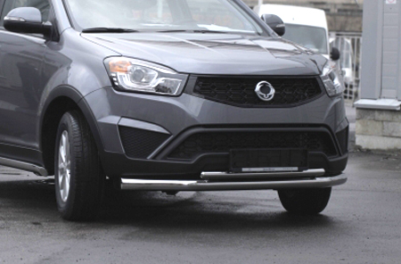 Двойная труба на бампер SsangYong Actyon защищает передний бампер автомобиля от различных механических повреждений при мелких ДТП и неудачных парковках, а также незаменима при езде по бездорожью. А кроме этого, труба на передний бампер Санг Енг Актион смотрится очень стильно и эффектно.