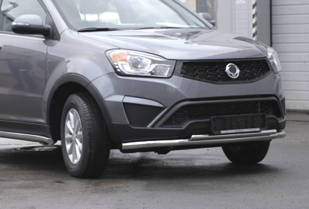 Двойная труба на бампер SsangYong Actyon защищает передний бампер автомобиля от различных механических повреждений при мелких ДТП и неудачных парковках, а также незаменима при езде по бездорожью. А кроме этого, труба на передний бампер Санг Енг Актион смотрится очень стильно и эффектно.