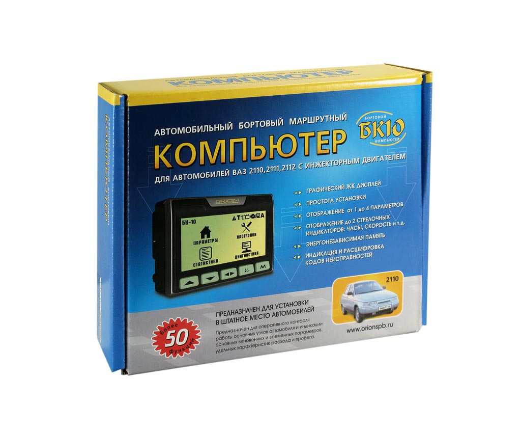 Орион (Orion) БК-10 - это современный бортовой компьютер, созданный для инсталляции в штатное место автомобилей ВАЗ (2112, 2110 и 2111), имеющих инжекторные моторы с блоками управления Bosch M1.5.4, Bosch MP 7.9.7 (Bosch 80), Январь 5…, Январь 7.2, Bosch MP 7.0 (Euro 2,3), Bosch М1.5.4N, VS 5.1 Ителма. Без установки в штатное место данный БК также может применяться в автомобилях ВАЗ (21099, Приора, 2108, 2109, Калина, 2120, 2115, "Классика", Нива), Шевроле-Нива, а также Daewoo (Sens), ЗАЗ (Славута), ИЖ (ОДА), оснащенных инжекторными моторами с блоком управления МИКАС 7.6.