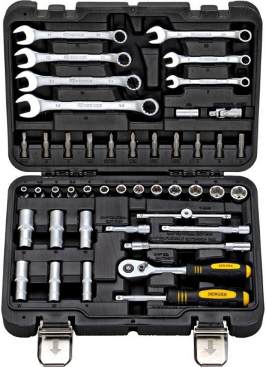 BERGER BG045-14 — это набор инструментов для автомобиля, который включает в себя 45 предметов: торцевые головки разного размера, ключ-трещотку с усиленным механизмом, биты разного типа, адаптер для бит, комбинированные ключи, удлинители, Т-образный вороток, шарнирный кардан и отвертку с присоединительным квадратом.