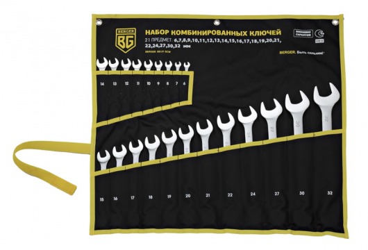 BERGER BG-21SCW — это набор комбинированных гаечных ключей, состоящий из 21 инструмента  – от 6 до 32 мм. Комбинированные ключи BERGER BG-21SCW хранятся в удобном чехле, в котором все ключи расположены строго по размеру.