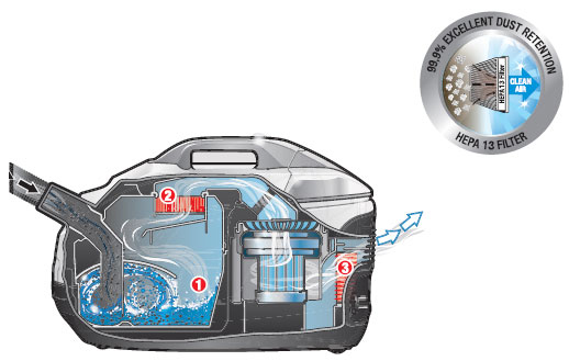 Водяной фильтр обеспечивает эффективную фильтрацию. В прозрачном корпусе этого фильтра остаются все крупные частицы грязи и пыли. И, несмотря на наполненность, гарантируется сохранение высокой силы всасывания.
