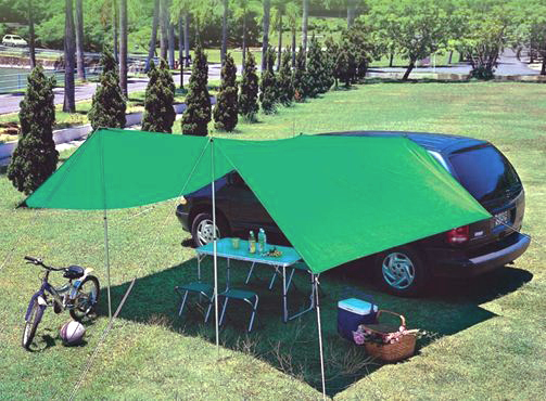 Одна часть натяжного тента надежно крепится к крыше авто при помощи специальных вакуумных присосок. Другая часть навеса фиксируется на земле стойками и растяжками.