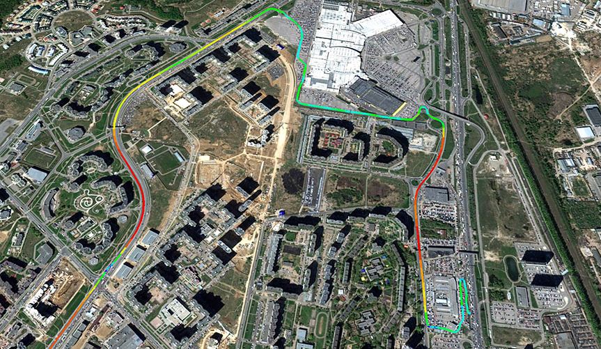 • GPS-трекер. GPS-приемник позволяет определять ваше местоположение во время движения (на 2-х картинках снизу: чем быстрее скорость, тем краснее маршрут). Запись данных с приемника и видеозапись ведутся одновременно, что делает ваш видеорегистратор бортовым самописцем.
