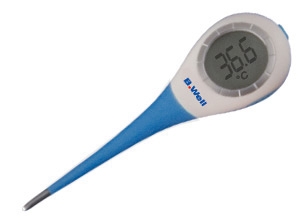 Цифровой термометр B.Well WT-07 оснащен большим дисплеем с крупными цифрами, а благодаря подсветке, вы можете измерять температуру тела даже при плохом освещении. Устройство имеет водонепроницаемый корпус, не содержит ртути и стекла, вследствие чего является абсолютно безопасным.