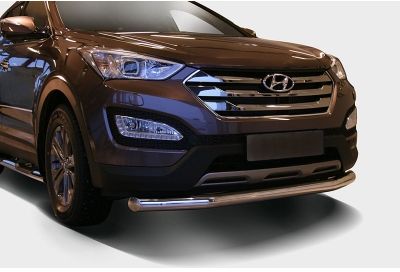 Защита переднего бампера труба предназначена для автомобилей Hyundai Grand Santa Fe от 2014 г.в. Вам не придется подгонять защиту под размеры бампера вашего авто. И с монтажом проблем не возникнет: установка защиты переднего бампера производится в штатные отверстия, а значит, необходимость сверлить кузов отпадает.