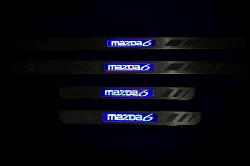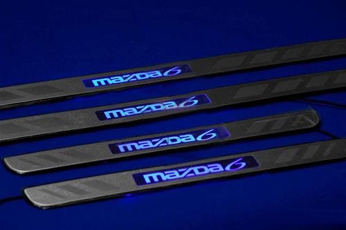 Светящиеся накладки на пороги Mazda 6 не входят ни в одну комплектацию этой модели автомобиля. Они позволят вам сделать свой автомобиль еще более оригинальным и стильным. Каждое открытие двери будет сопровождаться теплым синим светом.