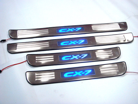 Светящиеся накладки на пороги Mazda CX-7 не входят ни в одну комплектацию этой модели автомобиля. Они органично впишутся в интерьер вашего автомобиля, дополняя светящиеся элементы панели управления, и позволят вам сделать свой автомобиль еще более оригинальным и стильным. Каждое открытие двери будет сопровождаться теплым синим светом. Кроме того, накладки оснащены специальными полосками, которые обеспечивают плотное соприкосновение ноги и порога.