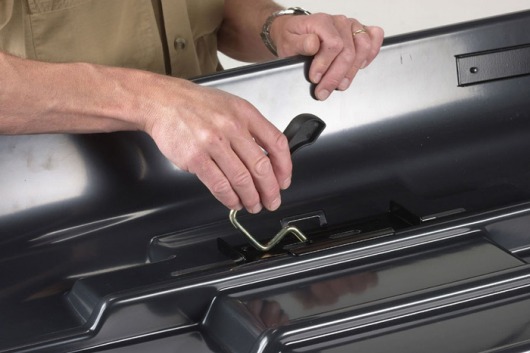 Бокс устанавливается на крышу, точнее на поперечины багажника, и подходит для любых автомобилей. Необходимое крепление уже находится внутри бокса, поэтому вам не придется использованть дополнительные инструменты. Несколько движений — и автобокс надежно установлен на крыше.