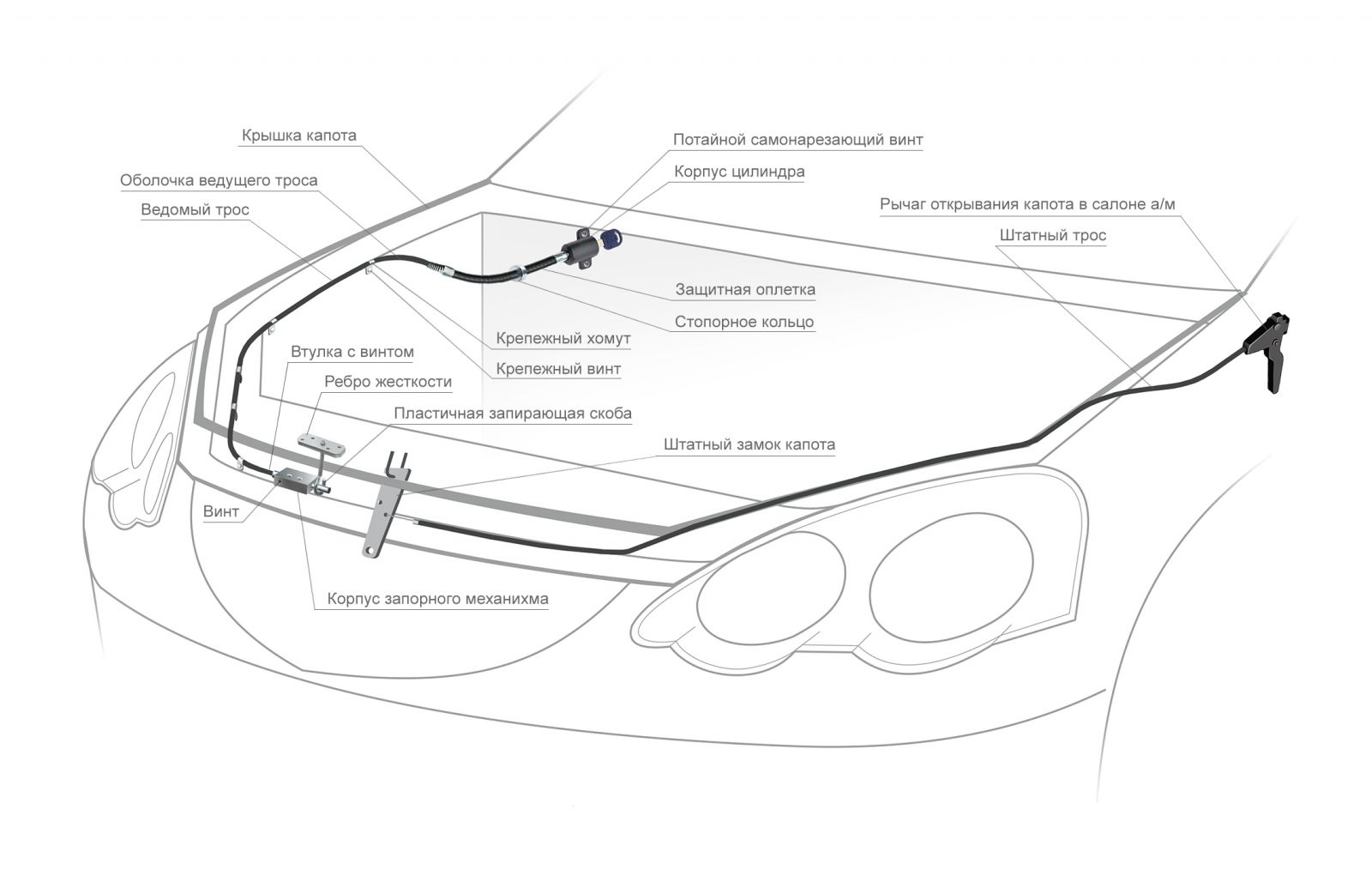 Механический замок капота Fortus Hood Lock Classic mini защищает ваш автомобиль от угона. Противоугонное устройство - эта система блокировки, которая управляет запорным механизмом с помощью специального троса с гибким корпусом.