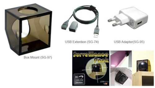 Surveillance Pack Camball - это специальные приспособления, которые позволят вам установить камеру Safebox Camball SG-31 в помещении и использовать ее как устройство слежения с охранными функциями. Ведь не зря эта камера имеет встроенный датчик движения. В комплект поставки входит специальное крепление, удлинитель кабеля USB, а так же специальный адаптер для USB на 220 Вольт.