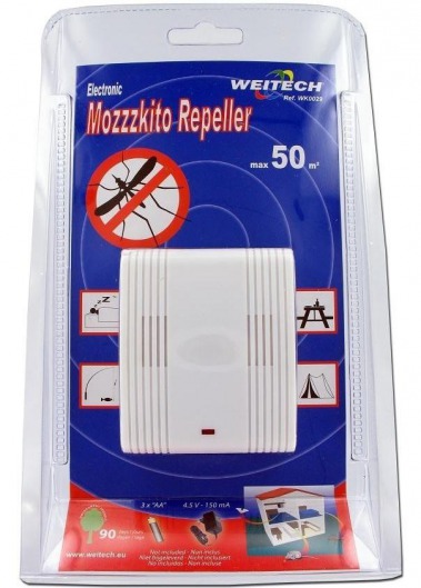 Отпугиватель Weitech WK-0029 посылает ультразвуковые волны, которые не воспринимаются человеком, но эффективно воздействуют на комаров и кровососущих насекомых. Как известно, после спаривания комарихи испытывают страх и отвращение к мужским особям. Излучатель отпугивателя производит ультразвук высокой частоты, аналогичный звуку, издаваемому комаром-самцом, и тем самым отпугивает всех "кусачих" комаров, т. е. оплодотворенных самок.