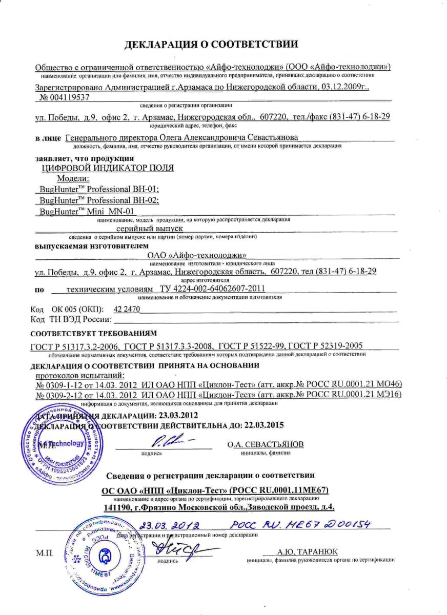 Обнаружитель шпионского оборудования профессионального класса BugHunter Professional BH-01 эффективно обнаруживает как аналоговые, так и цифровые жучки (любые радиомикрофоны, беспроводные камеры, мобильные телефоны и другие устройства). Детектор жучков работает в широком диапазоне частот — от 50 до 3000 МГц и имеет стабильно высокую чувствительность. Может работать в скрытом режиме при использовании наушников.