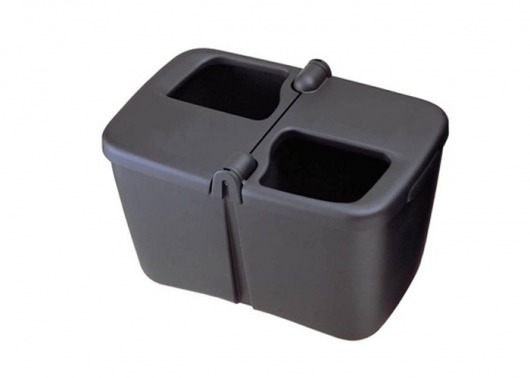 Контейнер для мусора FIZZ-845 изготовлен из черного прочного пластика. Для того, чтобы контейнер не переворачивался, в его дне установлен утяжелитель. Приспособление состоит из двух боксов, каждый из которых имеет крышку с отверстием для мусора. Размеры контейнера всего 275х170х160 мм, однако, этого вполне достаточно для хранения мусора между остановками.