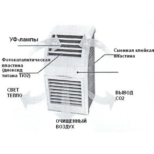 Внутри прибора установлена стальная пластина, покрытая диоксидом титана, а также 2 мощные ультрафиолетовые лампы. Когда устройство включено, свет от лампы, падая на пластину, активирует процесс фотокатализа. В результате данного процесса вырабатываются тепло и СО2 — то, что нужно для привлечения кровососущих насекомых.