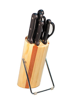 В набор входят: нож поварской 20 см; нож хлебный 20 см; нож для нарезки 20 см; нож кухонный 12 см; нож разделочный 9 см; ножницы кухонные; подставка из натурального дерева.
