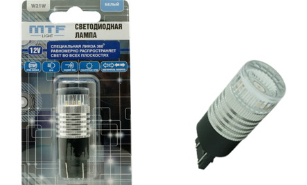 Уникальная бесцокольная светодиодная лампа MTF W21W рекордно энергоэкономична. Цвет света - желтый. Он очень яркий, однако при этом отлично воспринимается человеческим глазом. Линза 360° равномерно распространяет свет и полностью освещает площадь отражателя, которая расположена у основания лампы.