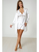 Очаровательный набор из легкого и приятного шелка включает в себя два предмета: - Шикарный халат средней длины с прозрачными кружевными вставками в виде нежных цветов в зоне плеч и на манжете рукава. - Ночная сорочка на лямочках с кружевной вставкой под зоной груди.