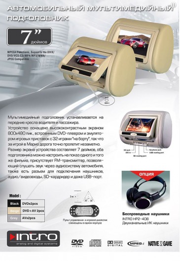 Универсальный подголовникс монитором 7" INTRO CDH-72выполнен в сером цвете и установливается на спинку переднего сиденья абсолютно любого автомобиля.  В данной модели есть встроенный DVD-проигрыватель и эмулятор игровых приставок с 32 играми.