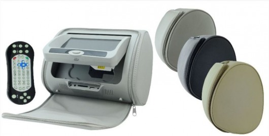В комплект входит 2 подголовника с экраном. Оба можно настроить на показ одного фильма, а с помощью встроенного FM-трансмиттер можно воспроизводить звук через аудиосистему авто без прокладки кабелей, даже если в автомагнитоле нет соответствующего аудиовходом. Помимо этого есть возможность подключения обычных и беспроводных ИК наушников, аудиовидео выходы, SD-картридер и USB-порт.