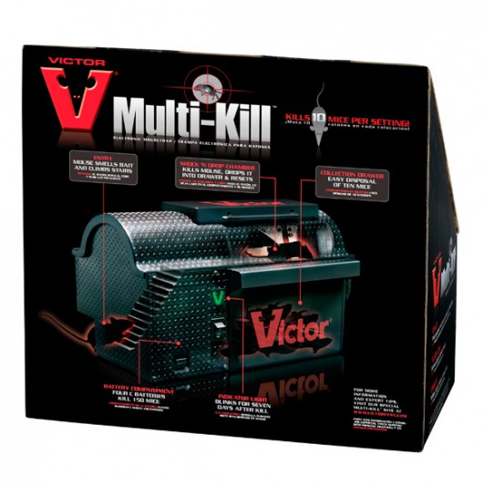 Электрический уничтожитель мышей Victor Multi-Kil представляет собой пластиковый короб с лестничным тоннельным входом и пластинами, на которых нужно разложить любую приманку. Мышь поднимается по ступенькам и попадет в разрядную камеру Shock N’ Drop, где она получает мощный электрический разряд, который убивает ее за пару секунд. Побег исключен! После этого дно разрядной камеры автоматически переворачивается, и мышь сбрасывается в закрытый контейнер, а прибор опять готов для поимки следующего грызуна. Так, в одном контейнере может набраться до 10 мышей.