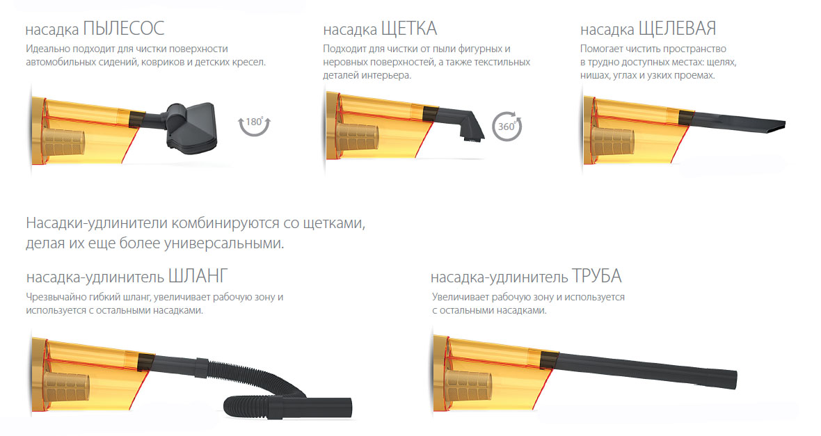 Питается совсем небольшой, но очень мощный AGR-150 от прикуривателя автомобиля. В комплекте с автомобильным пылесосом вы получите три насадки для труднодоступных мест салона, которые быстро и эффективно очищают от грязи и пыли те участки авто, до которых никак не добраться с помощью обычного бытового пылесоса.