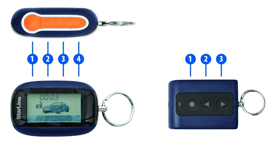 У основного 4-х кнопочного брелока реализован, так называемый,  принцип "основной кнопки". Основная кнопка активирует главную команду - включает режим охраны автомобиля. Меню брелока полностью на русском языке и имеет понятные иконки. В качестве дополнительных функций, в данной охранной системе реализована возможность контролировать заряд аккумулятора по напряжению, а так же выбор мелодии оповещения и регулировка громкости звуковых сигналов.