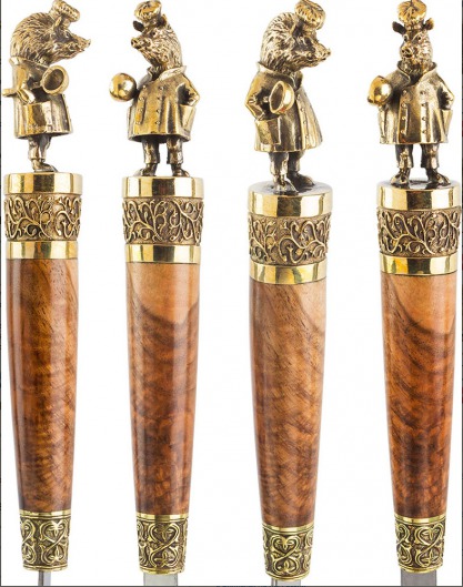 Особого внимания заслуживает ореховая рукоятка с литым бронзовым фигурным наконечником. Каждая фигурка — это автроская ювелирная работа. Ручка крупная, массивная, хорошо лежит в руке и при этом не перевешивает шампур.