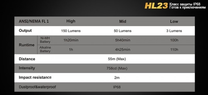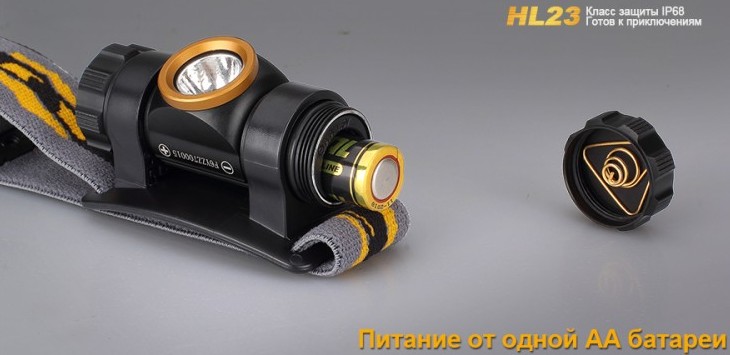 Налобный фонарь Fenix HL23 питается всего от 1 батареи стандарта АА. Производители рекомендуют использовать только качественные щелочные батареи и никель-магниевые аккумуляторы. В этом случае, от 1 щелочной батареи фонарь проработает до 110 ч. в экономном режиме, а от аккумулятора — до 100 ч. Также изделие защищено от неправильной установки батареи. Для удобства пользователей, уровень яркости света поддерживается на постоянном уровне в то время, как оставшийся заряд аккумулятора уменьшается.