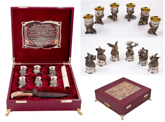 Бокалы-стопки упакованы в оригинальный ларец из дерева и натуральной кожи с декоративным панно, чтобы вы сразу же могли преподнести свой подарок.
