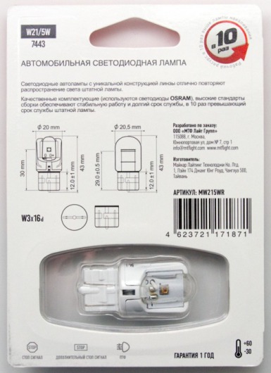 Светодиодная лампа MTF Light W21/5W 2/0.6W с уникальной конструкцией линзы отлично повторяет распространение света штатной лампы. Цвет свечения автолампы: красный.